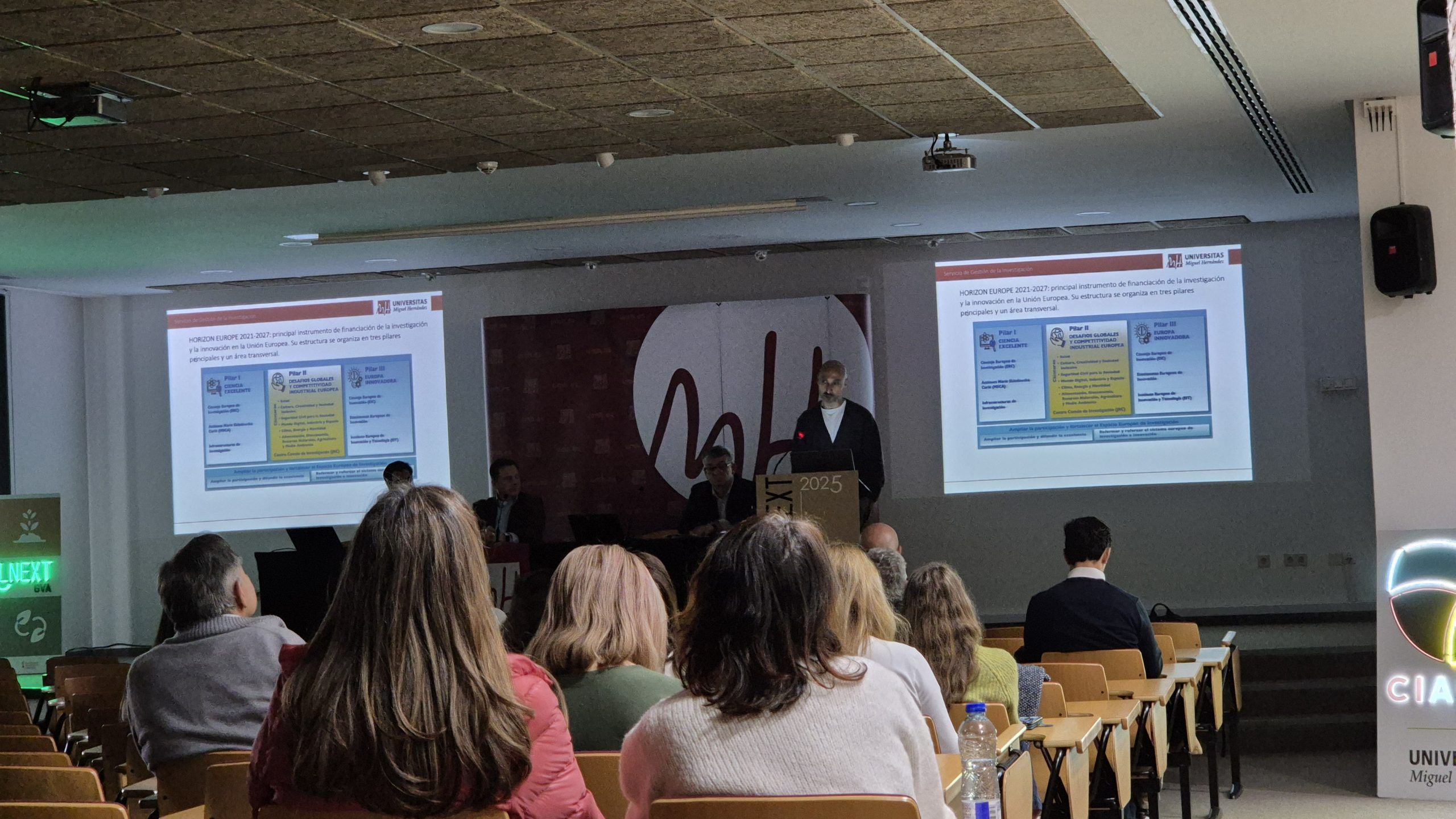 La Jornada del viernes 28 de febrero comenzó a las 9:30 horas con la Mesa Redonda sobre ‘Captura de recursos: Participación en propuestas europeas, nacionales y regionales en el contexto AGROALNEXT’, en el Edificio Biblioteca del Campus de Orihuela.